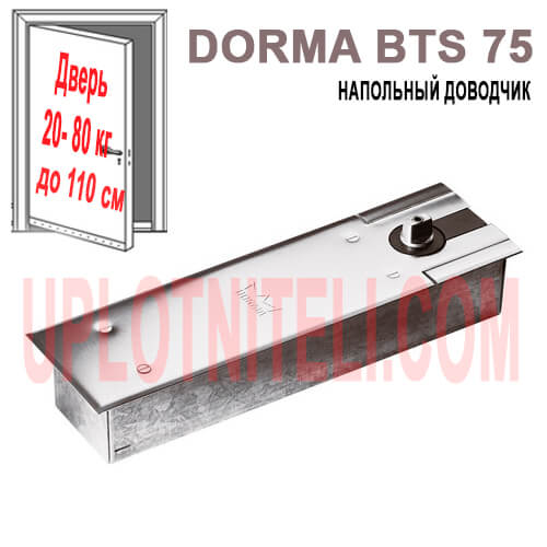DORMA BTS 75 V — напольный доводчик, подходящий ко всем стандартным дверям одностороннего или двустороннего действия, шириной до 1100 мм, имеет высокую степень приспособляемости, а также возможность отдельной регулировки силы закрытия с помощью регулировочного винта.