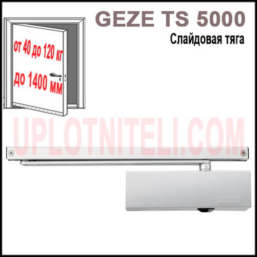 Дверний доводчик Geze TS 5000, як і модель 3000, оснащений так званою слайдовою або ковзною тягою. Його принципова відмінність полягає в галузі застосування – модель підійде для більш важких та широких дерев’яних, алюмінієвих чи металевих дверей. В іншому наявність ковзної тяги дозволяє забути про проблему економії простору в замкнутих приміщеннях. Підійде для встановлення як не ліво-, так і на правосторонні одно-і двостулкові конструкції.