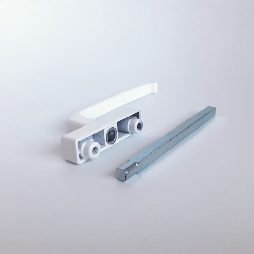 - Робимо примірку ручок без приводу. Буває, що штифт двосторонньої ручки балконних дверей (металевий квадрат перетином 7х7мм) роблять довше, ніж потрібно ваших дверей. І Гвинти можуть бути довшими, ніж потрібно. Ножівкою по металі обріжте штифт до потрібної довжини (сім разів відміряй!). Після приміряння виймаємо ручки і ставимо їх у положення “відкрито”.