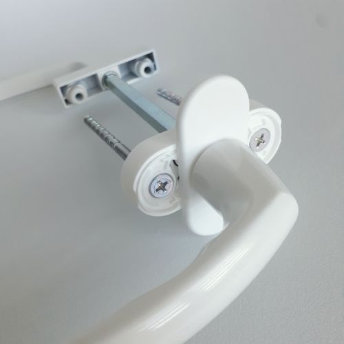 - Приміряємо двосторонню ручку на балконні двері. Нагадаємо, вона має встановлюватися у положенні “відкрито”. Якщо отвори просвердлені точно, ручка-гриф стане на належне місце. Зверніть увагу на форму зовнішньої ручки. Елемент ручки, в який гвинти вкручуються, спеціально виконаний несиметричним, щоб своїм корпусом не зачіпати раму. Закрийте двері, перевірте чи немає зачіплення і при необхідності переверніть цей елемент на 180 градусів. Зробіть пробні обороти ручкою, переконайтеся, що все працює.