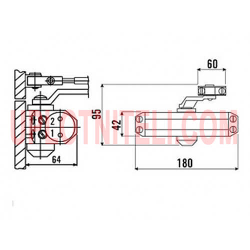 Комплект поставки TS 10 включает: сам доводчик eco ts 10, коленную (рычажную тягу), набор на крепление на двери и схему монтажа для нанесения разметочных отверстий.